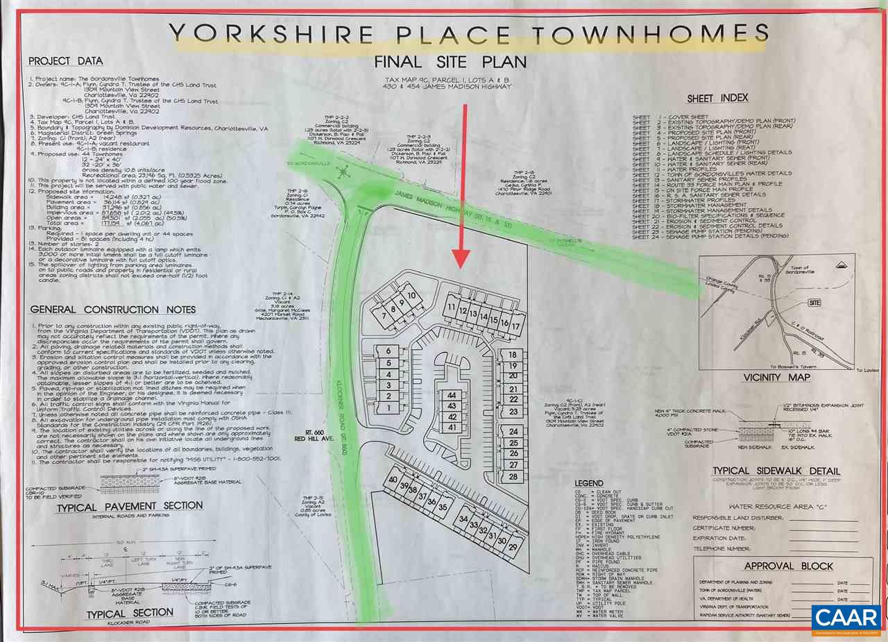 Unique development opportunity on a superb location! Nine parcels totaling 19.98 acres in Gordonsville with public water and sewer available. Five acres have already been rezoned and approved for 44 townhomes. A master plan is also available showing 109 townhomes and 5 commercial spaces. Site study, proposed townhome drawings, plans, and other intellectual information available to interested buyers. Call us to discuss this great investment opportunity! Agent related to seller.