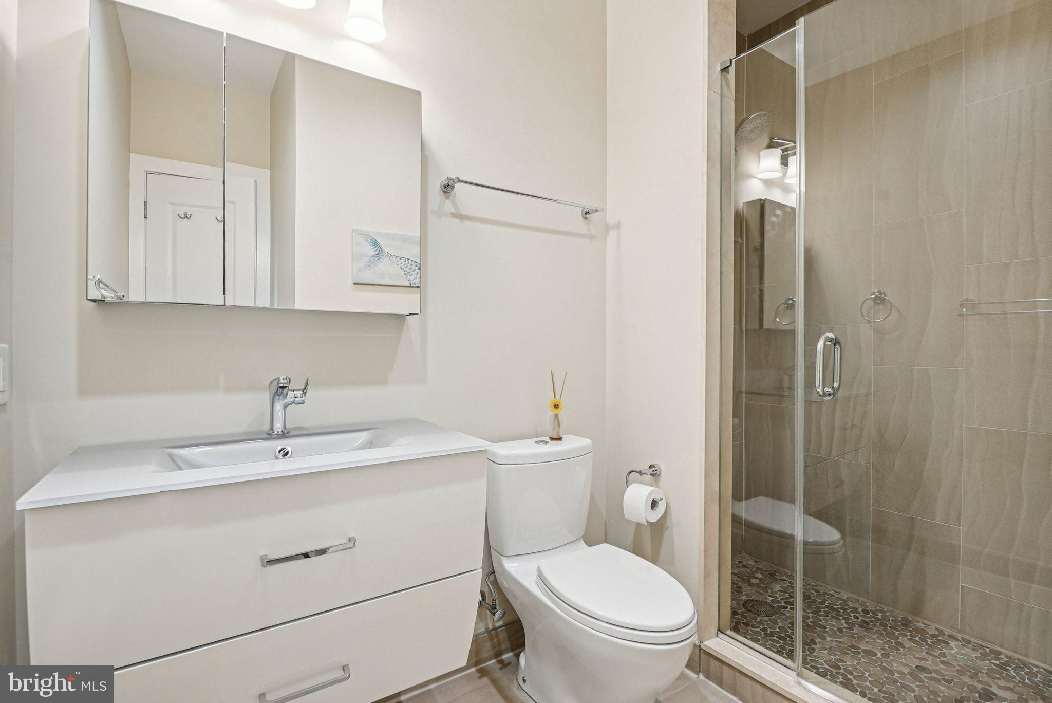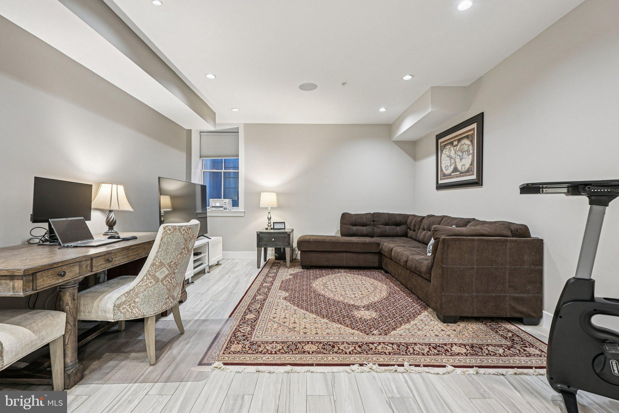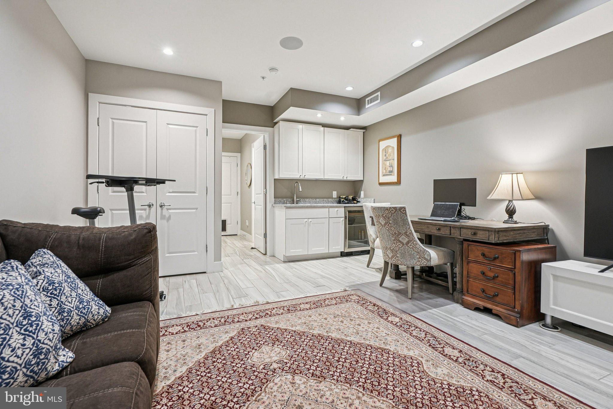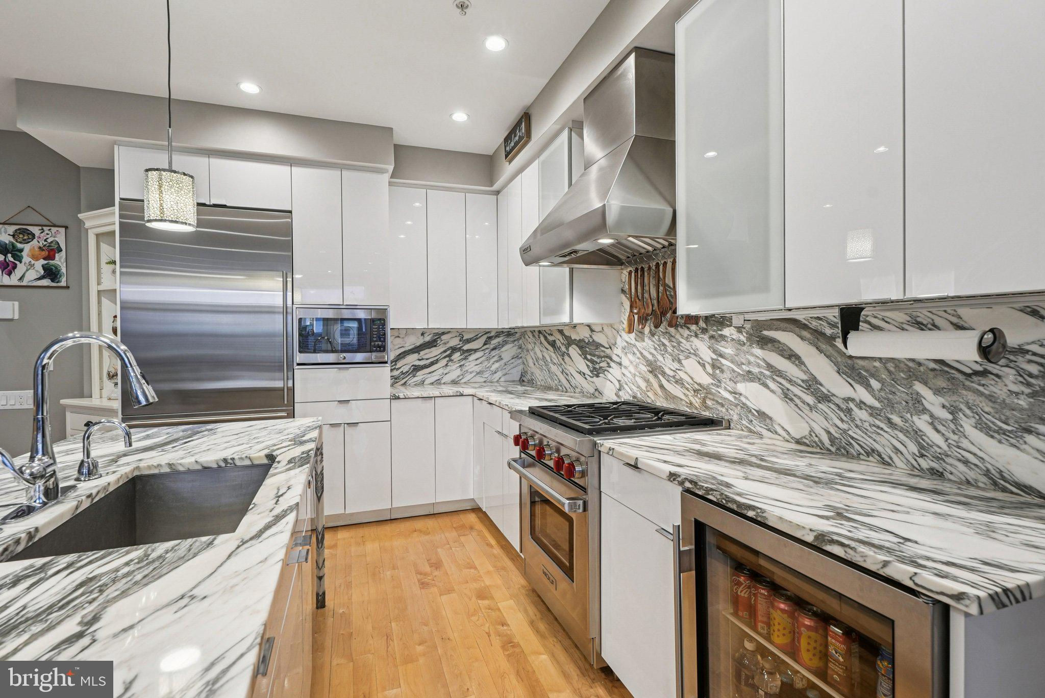 Welcome to 739 Bainbridge Street, a spacious three-story 4 bedroom, 4 full bath home with private one-car garage PARKING, ideally situated in the heart of Bella Vista/Queen Village within the sought-after Meredith School catchment. Completed in 2016, this modern residence offers sophisticated design, high-end finishes, and exceptional outdoor living. The gourmet kitchen is a chef’s dream, featuring a Wolf gas range, Sub-Zero refrigerator, sleek white cabinetry, marble countertops, and a marble waterfall island with bar seating, all open to the light-filled living and dining area. The living room is centered by a gas fireplace and framed by large windows overlooking the private patio - the perfect setting for relaxing or entertaining. Hardwood floors and recessed lighting are featured throughout the home. The 4th bedroom located in the finished basement is currently being used as a living area, complete with a full bath, wet bar, and a large utility room for storage space. The second floor features two spacious bedrooms, each with its own ensuite bath and double closets with custom shelving, along with a convenient laundry room including a sink and storage cabinets. The rear bedroom accommodates a king-sized bed, with the bathroom featuring a floating vanity and glass door tiled shower. The front bedroom is equally spacious, fitting a king-sized bed, with large windows bringing in plenty of natural light. The full bath was recently upgraded, with a stone-top vanity and glass enclosed tub shower with subway tile surround. The third floor hosts a versatile room currently used as an office, and the impressive primary suite with two walk-in closets, a private balcony, and an upgraded spa-like bath with a double vanity, glass-enclosed shower, heated tile flooring, and heated towel rack. The expansive roof deck, recently resealed, showcases panoramic views of the Center City skyline, an amazing space for entertaining and the perfect spot to enjoy the Penns Landing fireworks. This home is in a superb location, walking distance to South Street, grocery shopping at Whole Foods and ACME, the Italian Market, and an array of local favorites including Little Fish BYOB, Saloon, Fiorella Pasta, Taco Heart, The Sweet Life Bakeshop, and Isgro Pastries, with easy access to all that Center City has to offer.